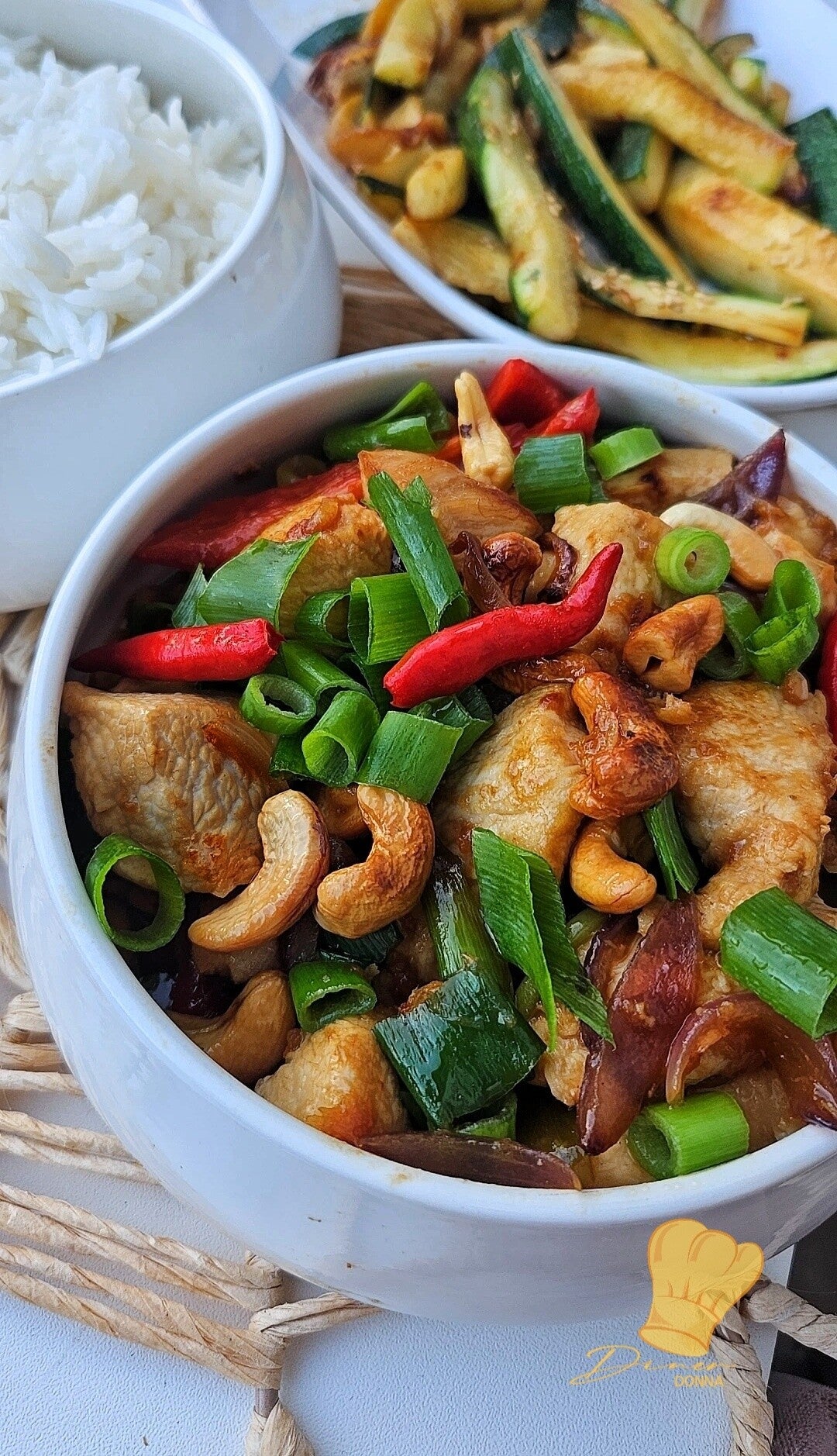 Snijd de ui in halve maantjes en bak in de olie, pers de knoflook en bak even mee. Snijd de witte gedeeltes van de lenteui door de lengte en bak nog een minuutje mee. Voeg de kip, cashew en rawit weer toe en nu ook de saus. Dit zal stroperig worden, voeg aan de hand daarvan een paar el water toe. Gebruik nu het groene gedeelte van de lenteui, snijd in ringetjes en voeg het 80 procent toe.Verhit alles enkele minuten en serveren maar.